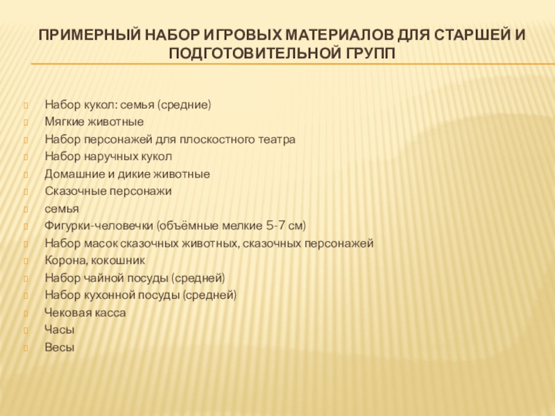 Слайд 3Примерный набор игровых материалов для старшей и подготовительной групп