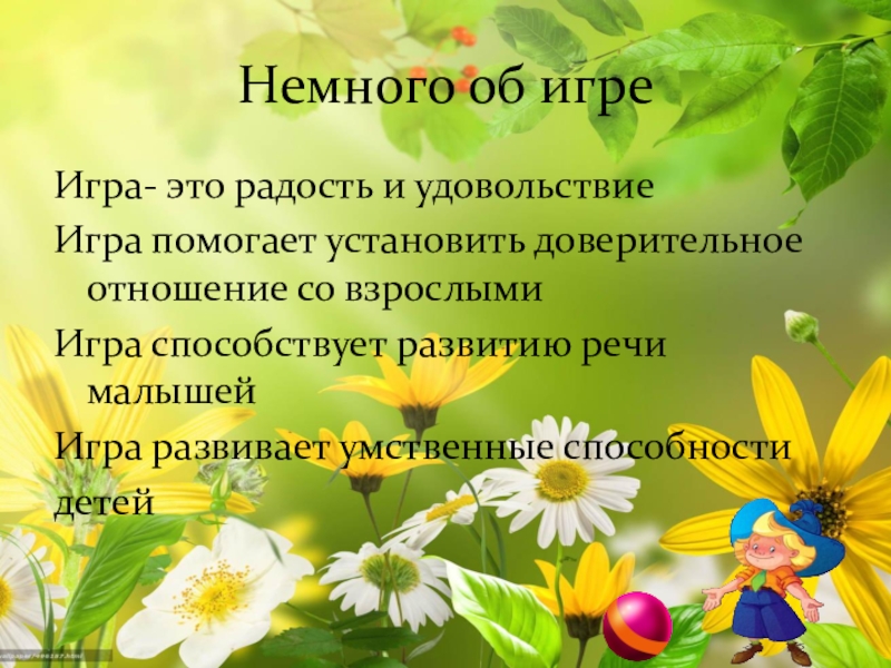 Немного об игре Игра- это радость и удовольствиеИгра помогает установить доверительное отношение со взрослымиИгра способствует развитию речи
