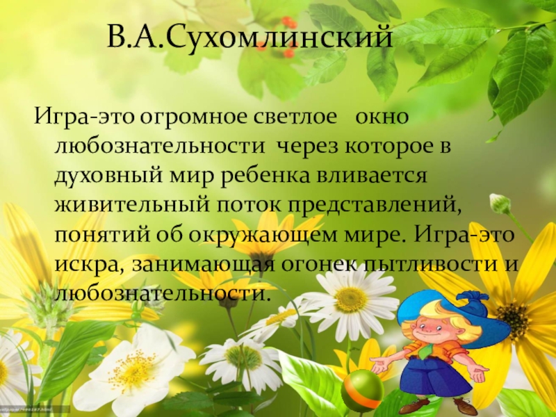 В.А.СухомлинскийИгра-это огромное светлое  окно любознательности через которое в духовный мир ребенка вливается живительный поток представлений, понятий