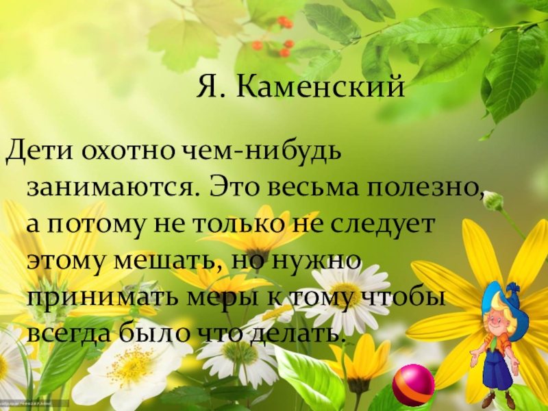 Я. КаменскийДети охотно чем-нибудь занимаются. Это весьма полезно, а потому не только не следует этому мешать, но