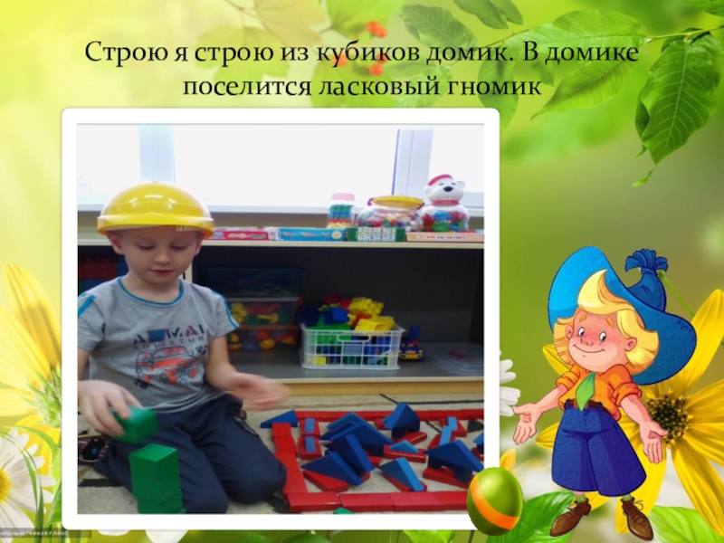 Слайд 10Строю я строю из кубиков домик. В домике поселится ласковый гномик