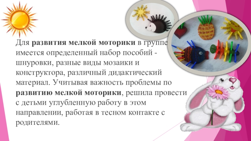шнуровки, разные виды мозаики и конструктора, различный дидактический материал. Учитывая важность проблемы по развитию мелкой моторики, решила провести с детьми углубленную работу в этом направлении, работая в тесном контакте с родителями.