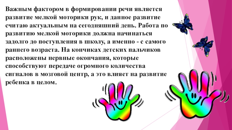 Слайд 2Важным фактором в формировании речи является развитие мелкой моторики рук, и