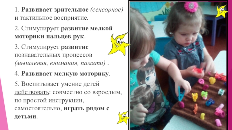 Слайд 101. Развивает зрительное (сенсорное) и тактильное восприятие.
