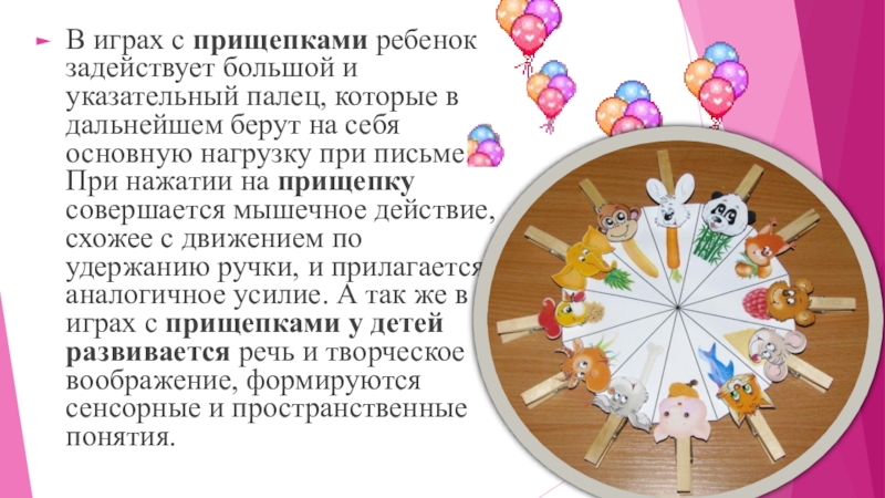 в дальнейшем берут на себя основную нагрузку при письме. При нажатии на прищепку совершается мышечное действие, схожее с движением по удержанию ручки, и прилагается аналогичное усилие. А так же в играх с прищепками у детей развивается речь и творческое воображение, формируются сенсорные и пространственные понятия.