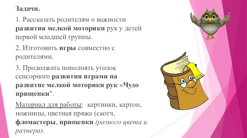 3. Продолжать пополнять уголок сенсорного развития играми на развитие мелкой моторики рук «Чудо прищепки".
