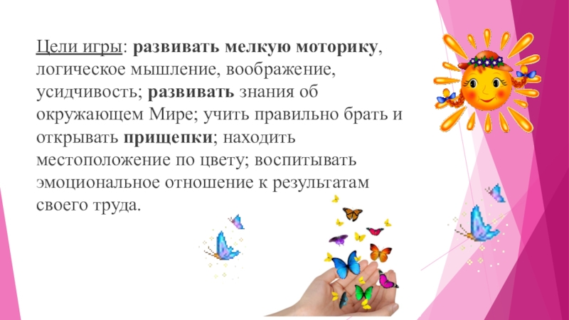 Слайд 7Цели игры: развивать мелкую моторику, логическое мышление, воображение, усидчивость; развивать знания