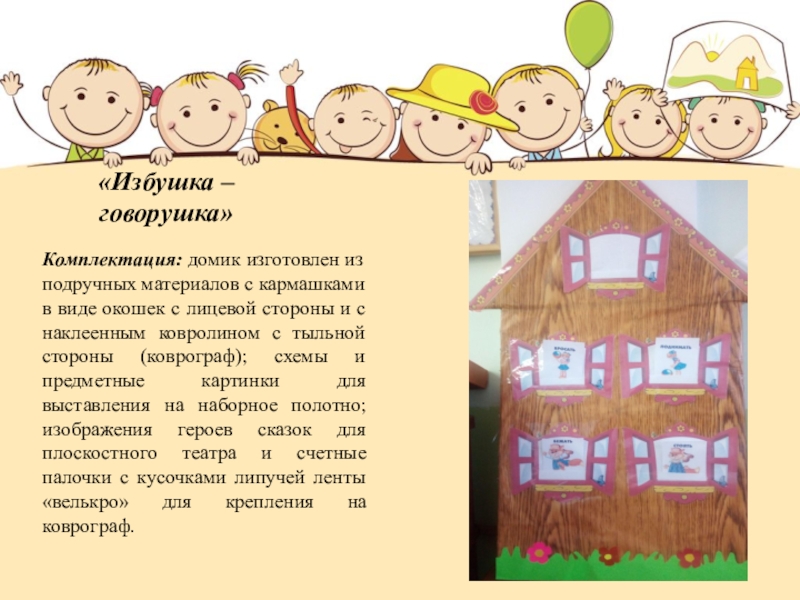 «Избушка – говорушка»Комплектация: домик изготовлен из подручных материалов с кармашками в виде окошек с лицевой стороны и с наклеенным ковролином с тыльной стороны (коврограф); схемы и предметные картинки для выставления на наборное полотно; изображения героев сказок
