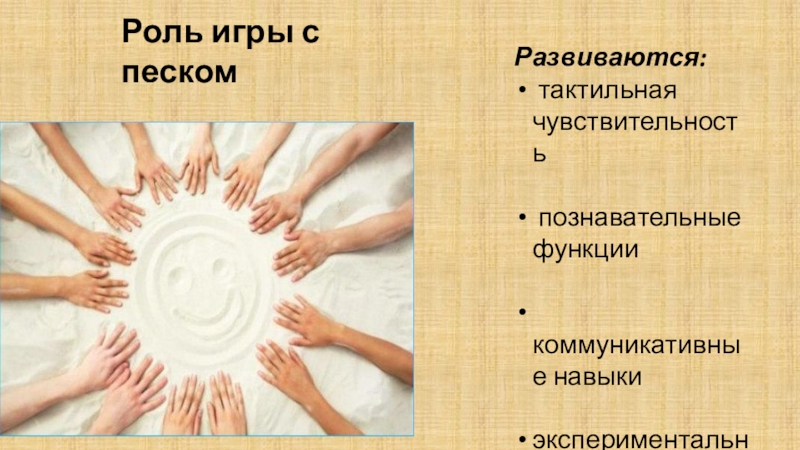 Роль игры с пескомРазвиваются: тактильная чувствительность познавательные функции коммуникативные навыкиэкспериментальная деятельность