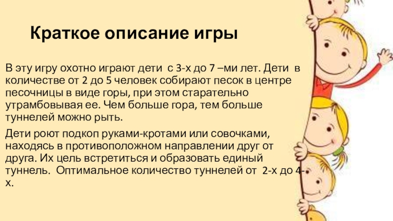 7 –ми лет. Дети в количестве от 2 до 5 человек собирают песок в центре песочницы в виде горы, при этом старательно утрамбовывая ее. Чем больше гора, тем больше туннелей можно рыть.