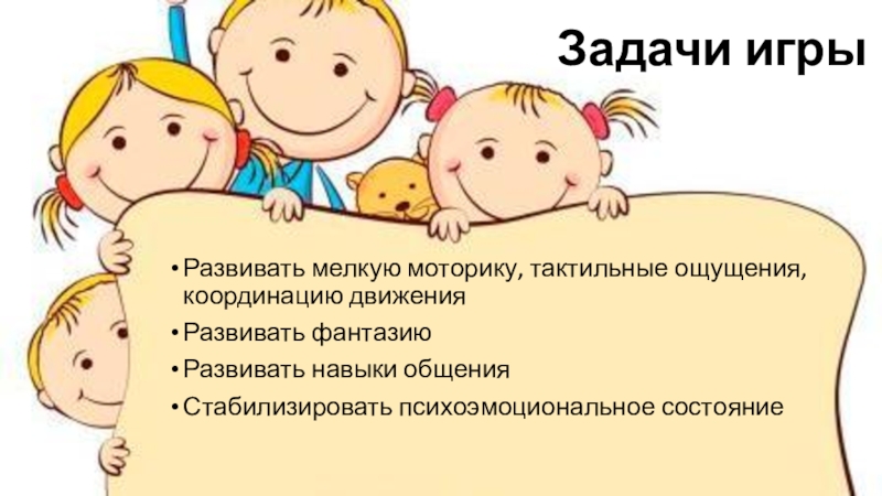 Задачи игрыРазвивать мелкую моторику, тактильные ощущения, координацию движенияРазвивать фантазиюРазвивать навыки общения