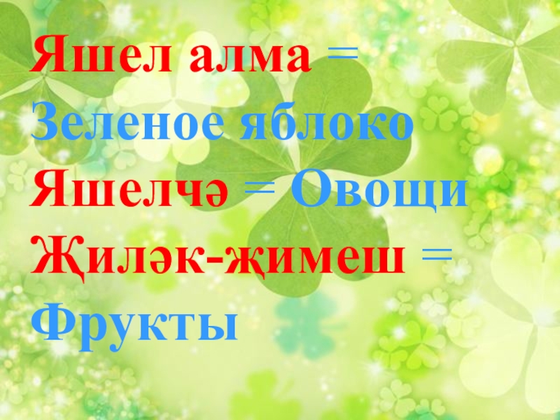 Слайд 10Яшел алма = Зеленое яблоко Яшелчә = Овощи Җиләк-җимеш = Фрукты