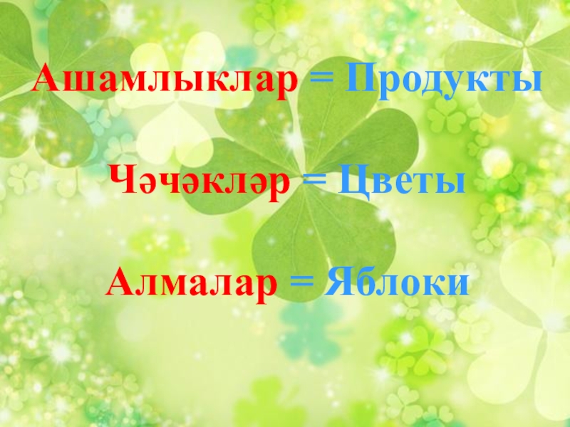 Ашамлыклар = Продукты  Чәчәкләр = Цветы  Алмалар = Яблоки
