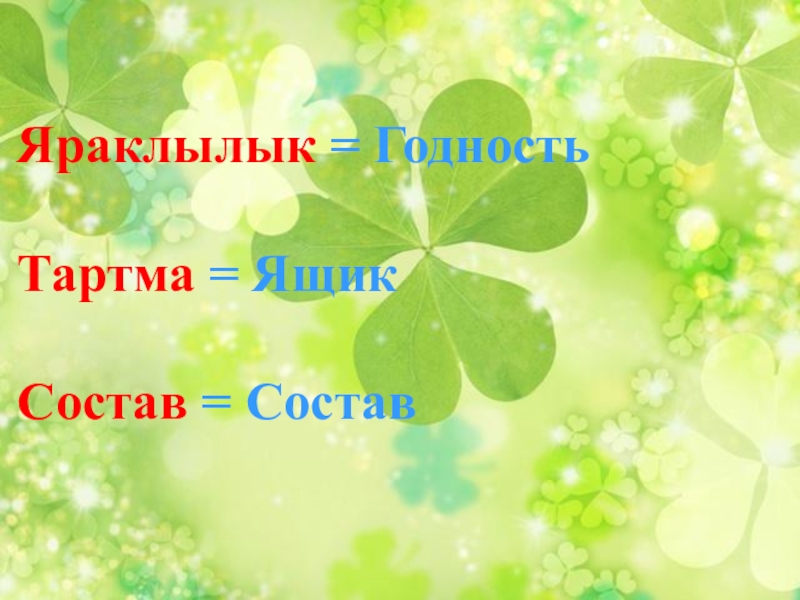 Слайд 18Яраклылык = Годность Тартма = Ящик Состав = Состав