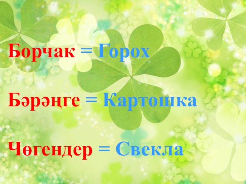 Слайд 24 Борчак = Горох Бәрәңге = Картошка Чөгендер =