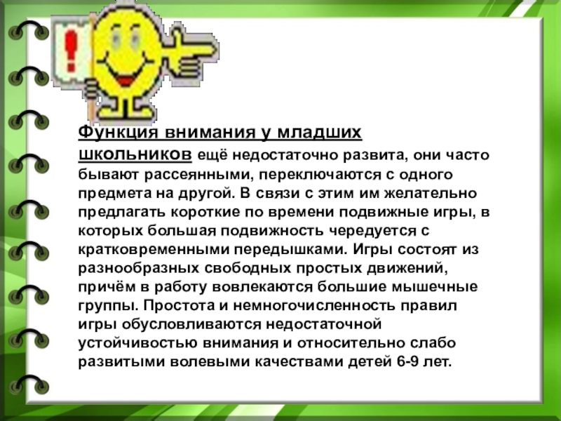 переключаются с одного предмета на другой. В связи с этим им желательно предлагать короткие по времени подвижные игры, в которых большая подвижность чередуется с кратковременными передышками. Игры состоят из разнообразных свободных простых движений, причём в работу вовлекаются большие мышечные группы. Простота и немногочисленность правил игры обусловливаются недостаточной устойчивостью внимания и относительно слабо развитыми волевыми качествами детей 6-9 лет.