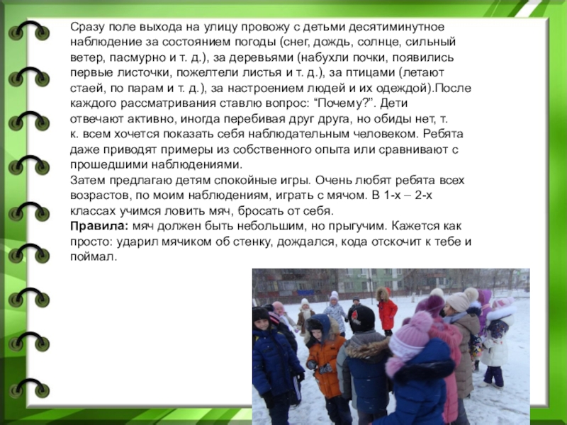 Слайд 11Сразу поле выхода на улицу провожу с детьми десятиминутное наблюдение за состоянием погоды (снег, дождь, солнце, сильный