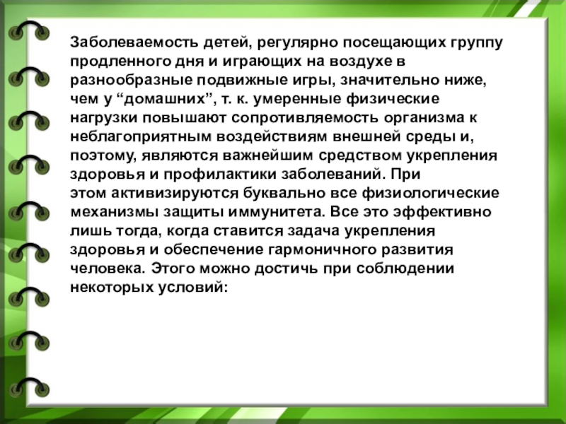 Слайд 8Заболеваемость детей, регулярно посещающих группу продленного дня и играющих на воздухе в разнообразные подвижные