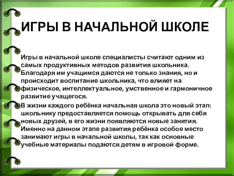 В жизни каждого ребёнка начальная школа это новый этап: школьнику предоставляется помощь открывать для себя новых друзей, в его жизни появляются новые занятия. Именно на данном этапе развития ребёнка особое место занимают игры в начальной школы, так как основные учебные материалы подаются детям в игровой форме.