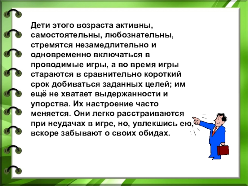 в проводимые игры, а во время игры стараются в сравнительно короткий срок добиваться заданных целей; им ещё не хватает выдержанности и упорства. Их настроение часто меняется. Они легко расстраиваются при неудачах в игре, но, увлекшись ею, вскоре забывают о своих обидах.