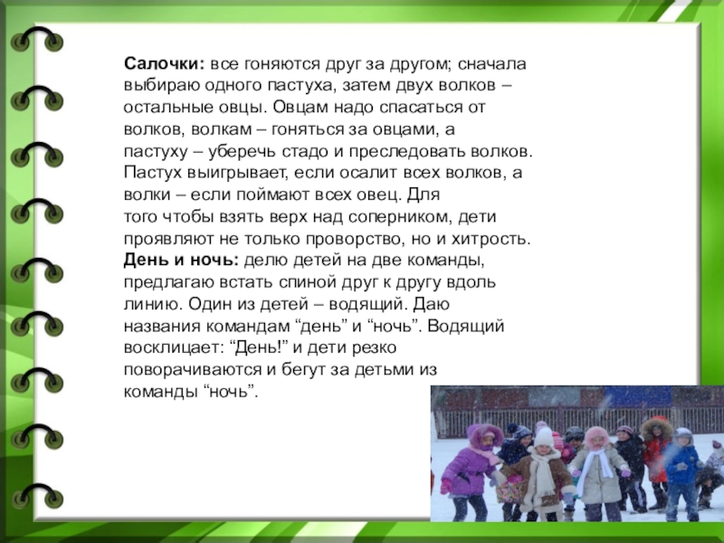 Слайд 13Салочки: все гоняются друг за другом; сначала выбираю одного пастуха, затем двух волков –