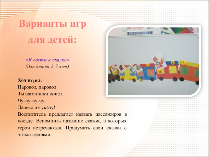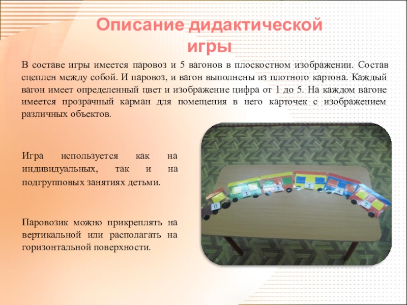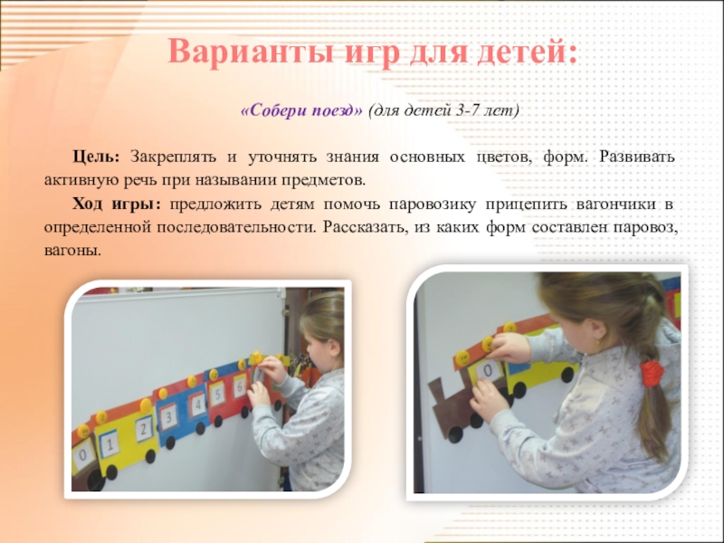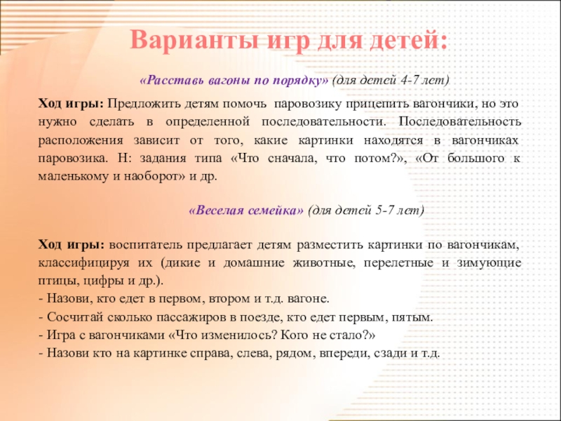 Ход игры: воспитатель предлагает детям разместить картинки по вагончикам, классифицируя их (дикие и домашние животные, перелетные и зимующие птицы, цифры и др.).
