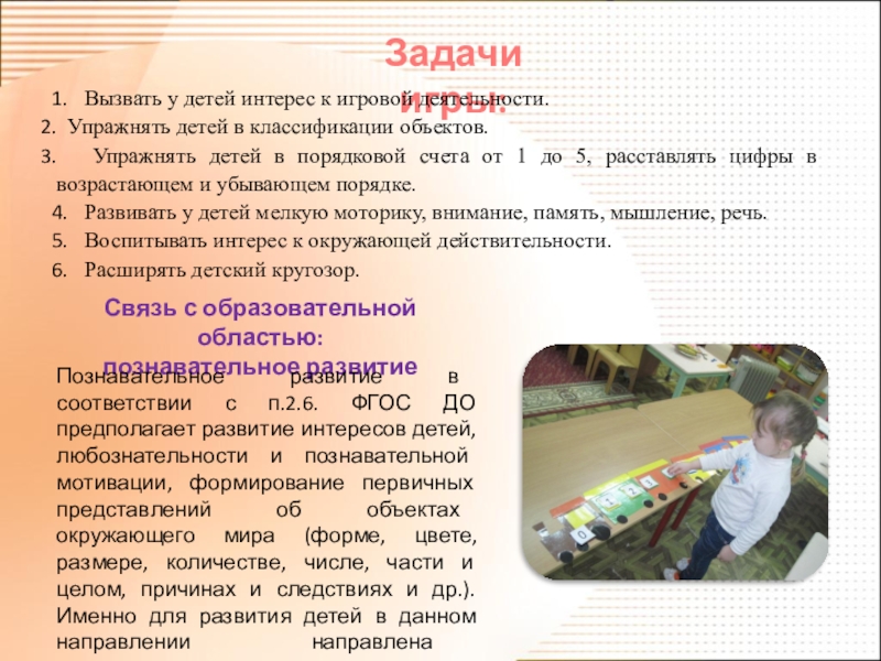 Познавательное развитие в соответствии с п.2.6. ФГОС ДО предполагает развитие интересов детей, любознательности и познавательной мотивации, формирование первичных представлений об объектах окружающего мира (форме, цвете, размере, количестве, числе, части и целом, причинах и следствиях и др.). Именно для развития детей в данном направлении направлена представленная игра.