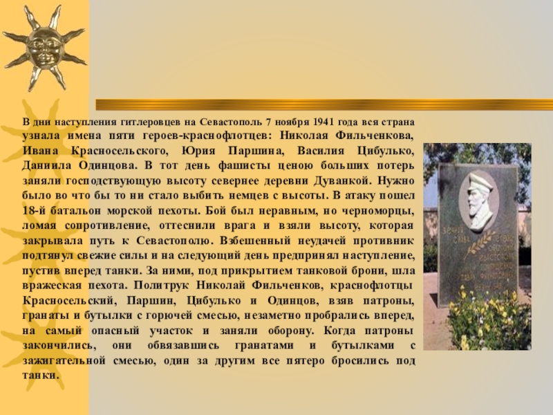 страна узнала имена пяти героев-краснофлотцев: Николая Фильченкова, Ивана Красносельского, Юрия Паршина, Василия Цибулько, Даниила Одинцова. В тот день фашисты ценою больших потерь заняли господствующую высоту севернее деревни Дуванкой. Нужно было во что бы то ни стало выбить немцев с высоты. В атаку пошел 18-й батальон морской пехоты. Бой был неравным, но черноморцы, ломая сопротивление, оттеснили врага и взяли высоту, которая закрывала путь к Севастополю. Взбешенный неудачей противник подтянул свежие силы и на следующий день предпринял наступление, пустив вперед танки. За ними, под прикрытием танковой брони, шла вражеская пехота. Политрук Николай Фильченков, краснофлотцы Красносельский, Паршин, Цибулько и Одинцов, взяв патроны, гранаты и бутылки с горючей смесью, незаметно пробрались вперед, на самый опасный участок и заняли оборону. Когда патроны закончились, они обвязавшись гранатами и бутылками с зажигательной смесью, один за другим все пятеро бросились под танки.