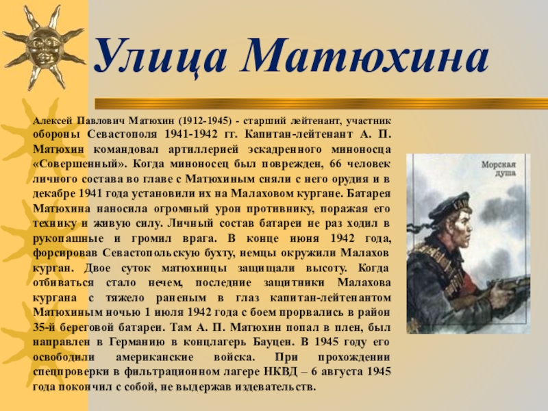 Севастополя 1941-1942 гг. Капитан-лейтенант А. П. Матюхин командовал артиллерией эскадренного миноносца «Совершенный». Когда миноносец был поврежден, 66 человек личного состава во главе с Матюхиным сняли с него орудия и в декабре 1941 года установили их на Малаховом кургане. Батарея Матюхина наносила огромный урон противнику, поражая его технику и живую силу. Личный состав батареи не раз ходил в рукопашные и громил врага. В конце июня 1942 года, форсировав Севастопольскую бухту, немцы окружили Малахов курган. Двое суток матюхинцы защищали высоту. Когда отбиваться стало нечем, последние защитники Малахова кургана с тяжело раненым в глаз капитан-лейтенантом Матюхиным ночью 1 июля 1942 года с боем прорвались в район 35-й береговой батареи. Там А. П. Матюхин попал в плен, был направлен в Германию в концлагерь Бауцен. В 1945 году его освободили американские войска. При прохождении спецпроверки в фильтрационном лагере НКВД – 6 августа 1945 года покончил с собой, не выдержав издевательств.