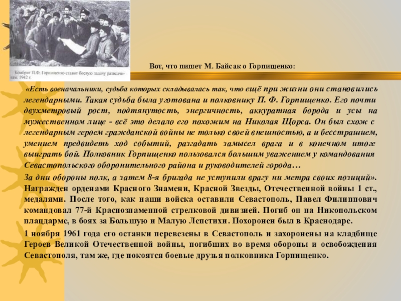 «Есть военачальники, судьба которых складывалась так, что ещё при жизни они становились легендарными. Такая судьба была уготована и полковнику П. Ф. Горпищенко. Его почти двухметровый рост, подтянутость, энергичность, аккуратная борода и усы на мужественном лице - всё это делало его похожим на Николая Щорса. Он был схож с легендарным героем гражданской войны не только своей внешностью, а и бесстрашием, умением предвидеть ход событий, разгадать замысел врага и в конечном итоге выиграть бой. Полковник Горпищенко пользовался большим уважением у командования Севастопольского оборонительного района и руководителей города…