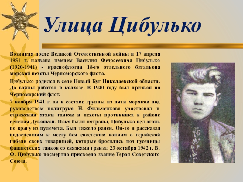 названа именем Василия Федосеевича Цибулько (1920-1941) - краснофлотца 18-го отдельного батальона морской пехоты Черноморского флота.