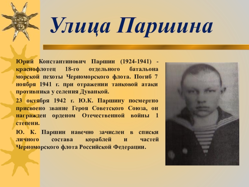 Юрий Константинович Паршин (1924-1941) - краснофлотец 18-го отдельного батальона