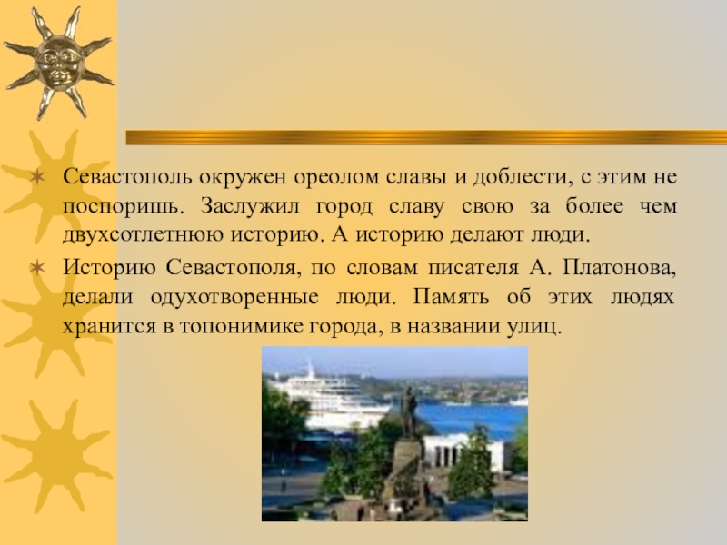 Историю Севастополя, по словам писателя А. Платонова, делали одухотворенные люди. Память об этих людях хранится в топонимике города, в названии улиц.