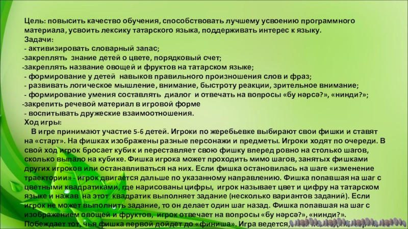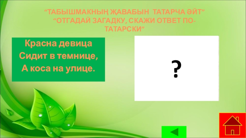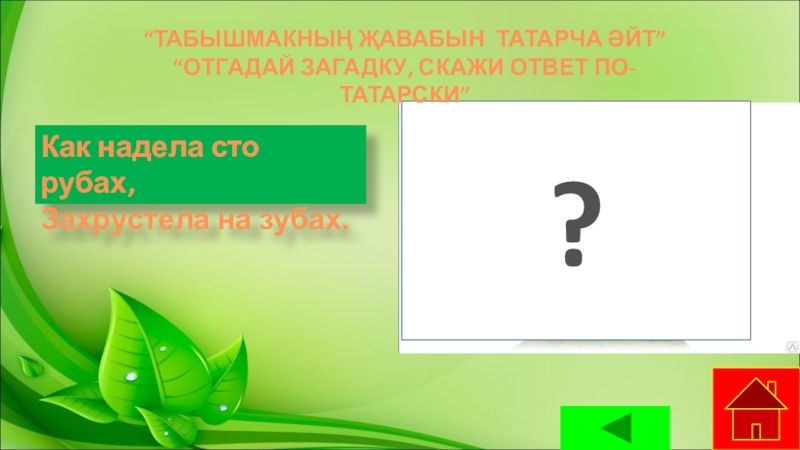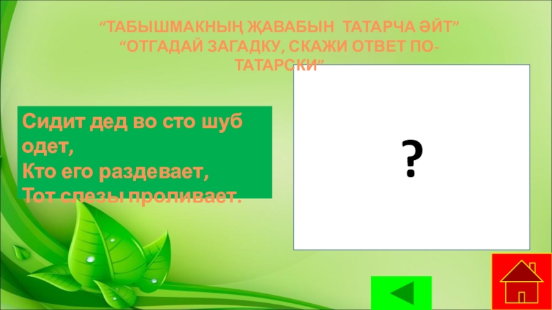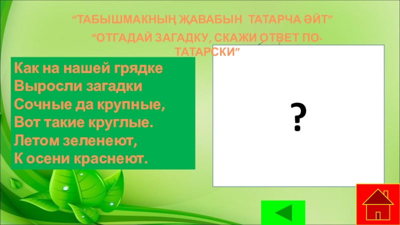 “ТАБЫШМАКНЫҢ ҖАВАБЫН ТАТАРЧА ӘЙТ” “ОТГАДАЙ ЗАГАДКУ, СКАЖИ ОТВЕТ ПО- ТАТАРСКИ”