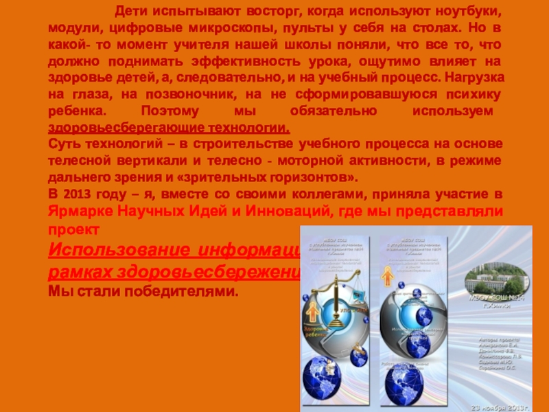 используют ноутбуки, модули, цифровые микроскопы, пульты у себя на столах. Но в какой- то момент учителя нашей школы поняли, что все то, что должно поднимать эффективность урока, ощутимо влияет на здоровье детей, а, следовательно, и на учебный процесс. Нагрузка на глаза, на позвоночник, на не сформировавшуюся психику ребенка. Поэтому мы обязательно используем здоровьесберегающие технологии.