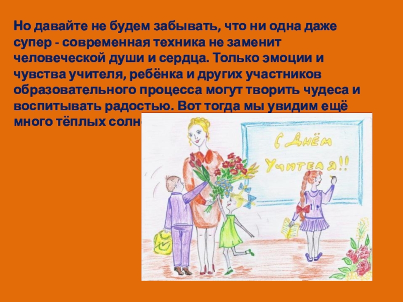 современная техника не заменит человеческой души и сердца. Только эмоции и чувства учителя, ребёнка и других участников образовательного процесса могут творить чудеса и воспитывать радостью. Вот тогда мы увидим ещё много тёплых солнечных лучиков !