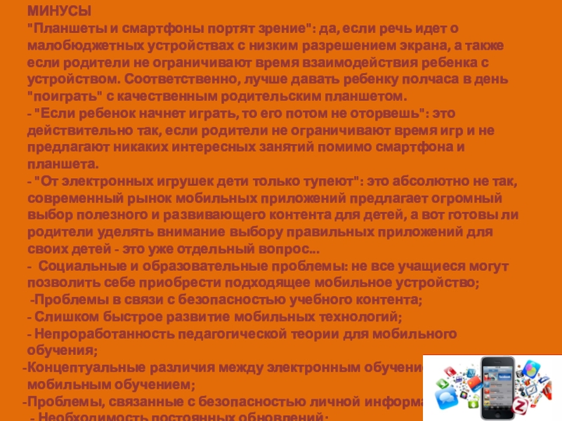 Слайд 23Безусловные плюсы мобильных устройств, или почему большинство детей все равно ими