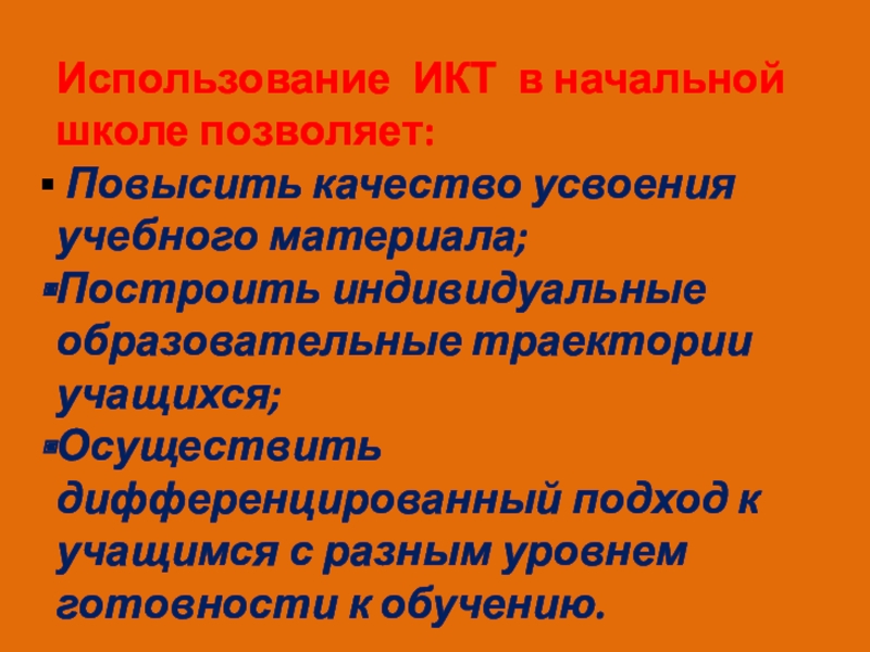 Слайд 33Использование ИКТ в начальной школе позволяет: