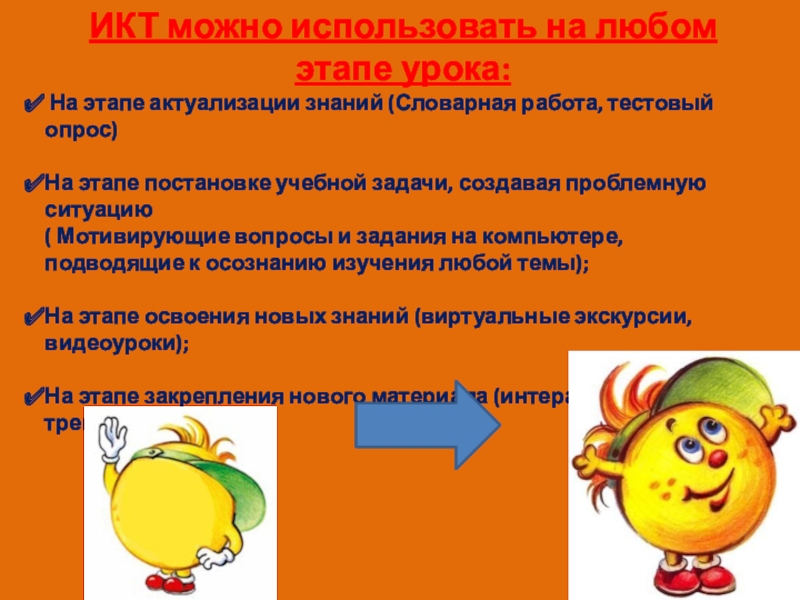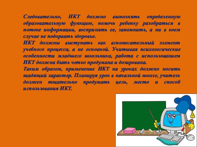 ИКТ должны выступать как вспомогательный элемент учебного процесса, а не основной. Учитывая психологические особенности младшего школьника, работа с использованием ИКТ должна быть четко продумана и дозирована.