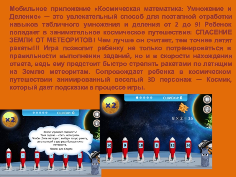 Слайд 22Мобильное приложение «Космическая математика: Умножение и Деление» — это увлекательный способ