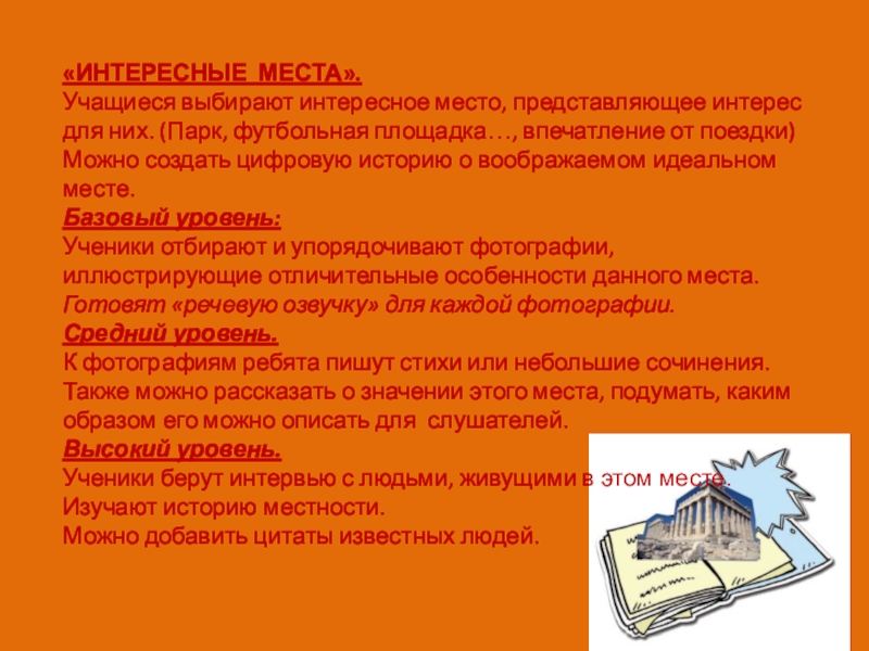 Ученики отбирают и упорядочивают фотографии, иллюстрирующие отличительные особенности данного места. Готовят «речевую озвучку» для каждой фотографии.