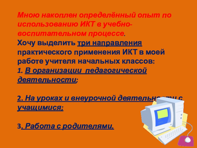выделить три направления практического применения ИКТ в моей работе учителя начальных классов: