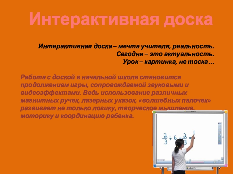 Работа с доской в начальной школе становится продолжением игры, сопровождаемой звуковыми и видеоэффектами. Ведь использование различных магнитных ручек, лазерных указок, «волшебных палочек» развивает не только логику, творческое мышление, моторику и координацию ребенка.