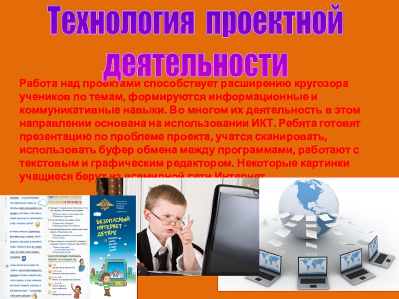 и коммуникативные навыки. Во многом их деятельность в этом направлении основана на использовании ИКТ. Ребята готовят презентацию по проблеме проекта, учатся сканировать, использовать буфер обмена между программами, работают с текстовым и графическим редактором. Некоторые картинки учащиеся берут из всемирной сети Интернет.