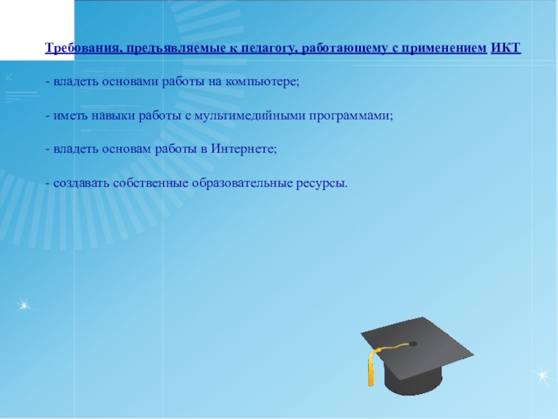 Слайд 12Требования, предъявляемые к педагогу, работающему с применением ИКТ