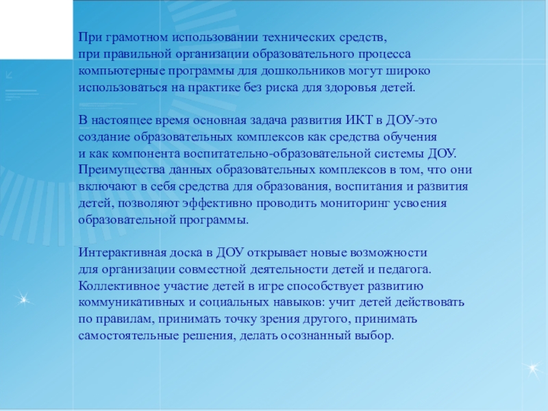В настоящее время основная задача развития ИКТ в ДОУ-это