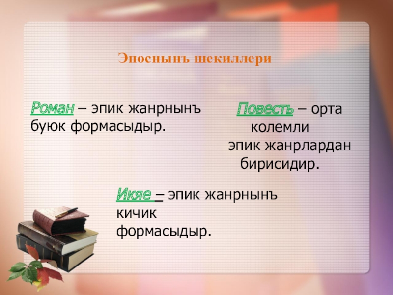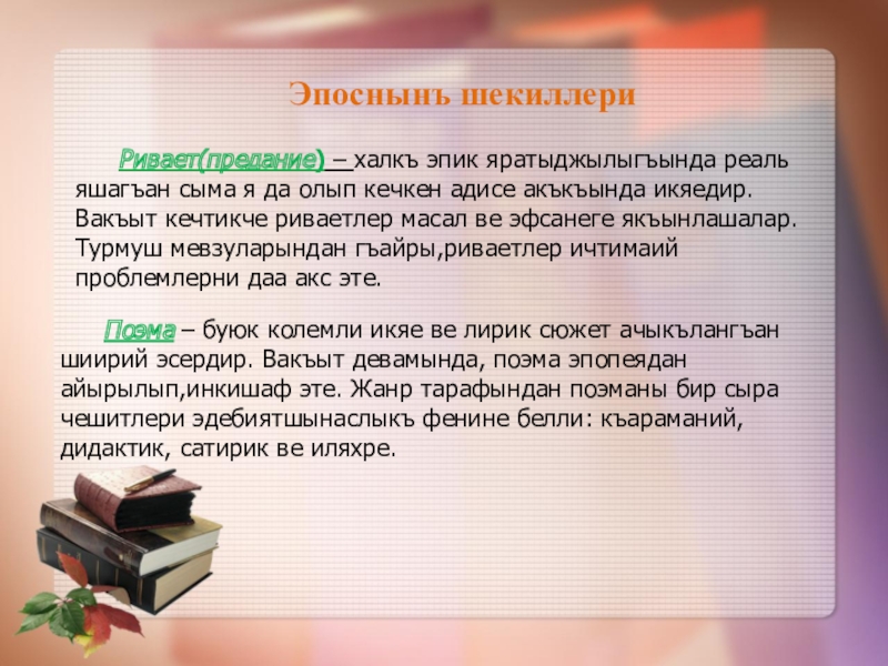 Поэма – буюк колемли икяе ве лирик сюжет ачыкълангъан шиирий эсердир. Вакъыт девамында, поэма эпопеядан айырылып,инкишаф эте. Жанр тарафындан поэманы бир сыра чешитлери эдебиятшынаслыкъ фенине белли: къараманий,дидактик, сатирик ве иляхре.