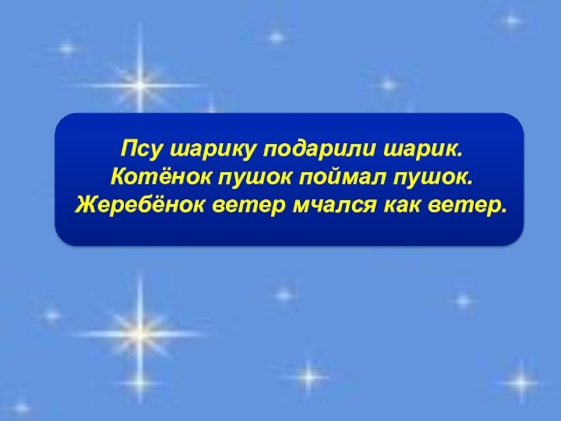 Псу шарику подарили шарик.Котёнок пушок поймал пушок.Жеребёнок ветер мчался как ветер.