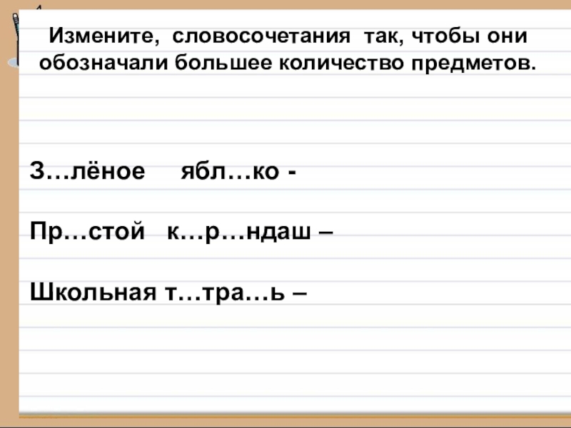 Измените, словосочетания так, чтобы они обозначали большее количество предметов.