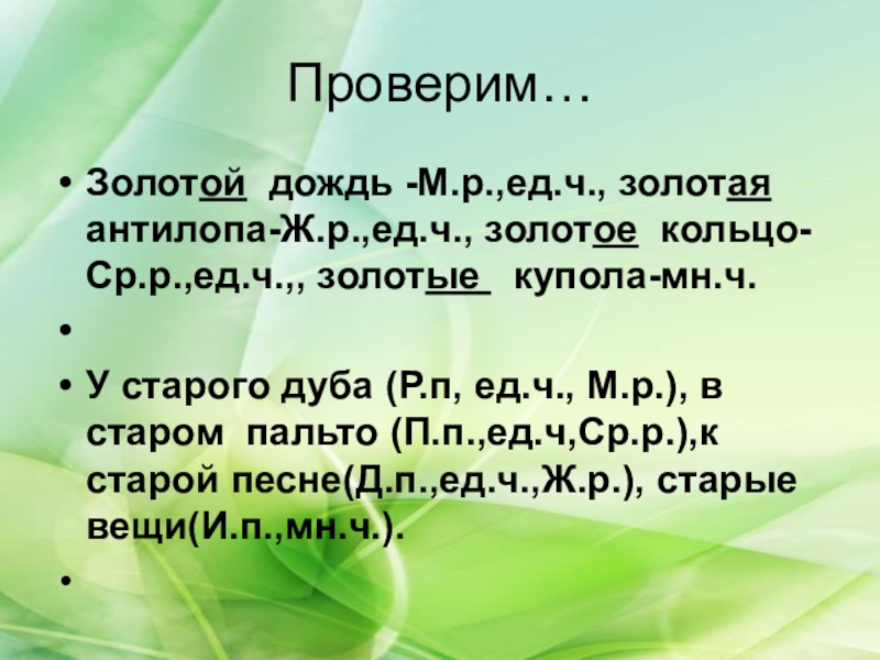 Золотой дождь -М.р.,ед.ч., золотая антилопа-Ж.р.,ед.ч., золотое кольцо-Ср.р.,ед.ч.,, золотые купола-мн.ч.